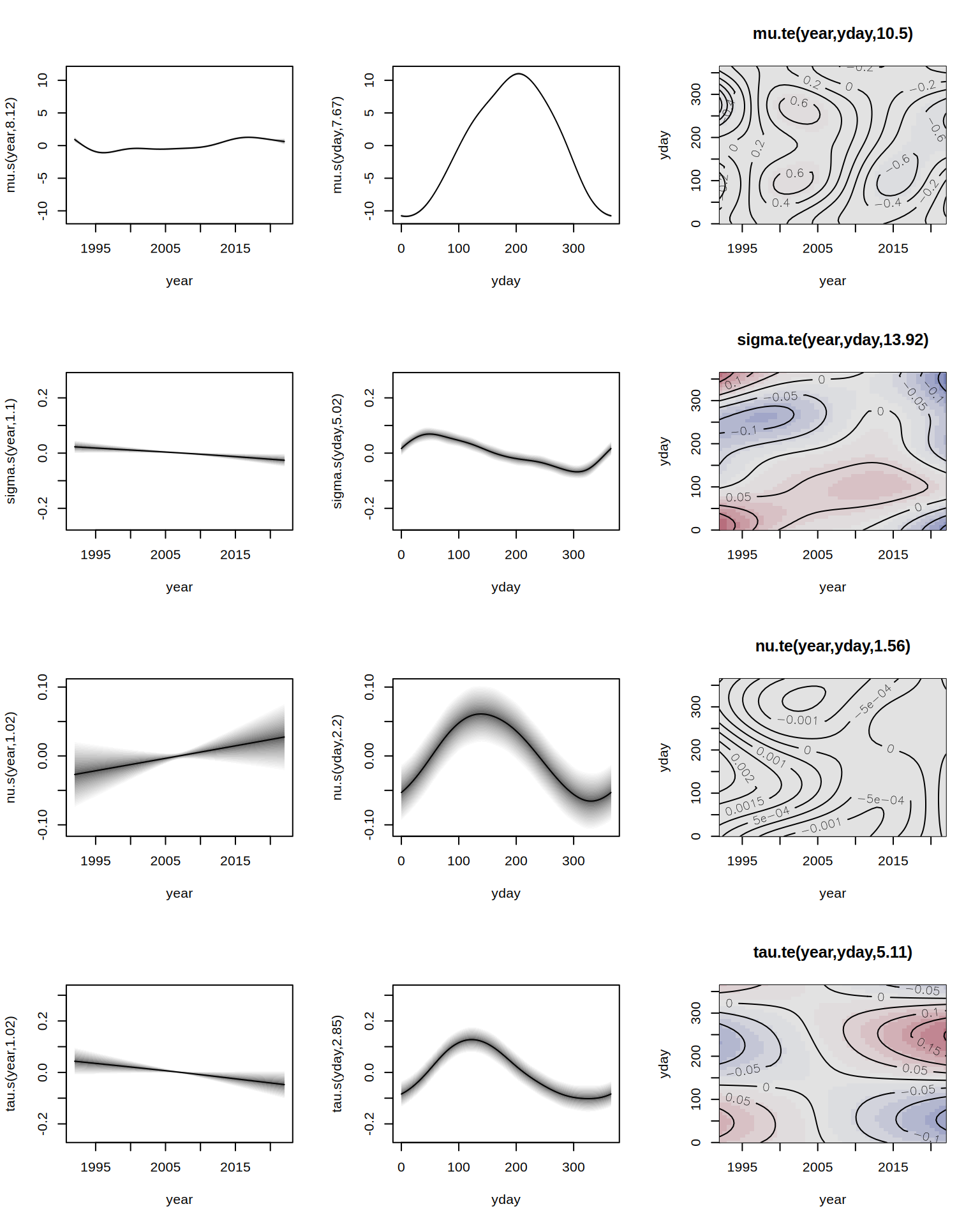 library("gamlss.add")f1 <- Tmax ~ ga(~ s(year) + s(yday, bs = "cc") +