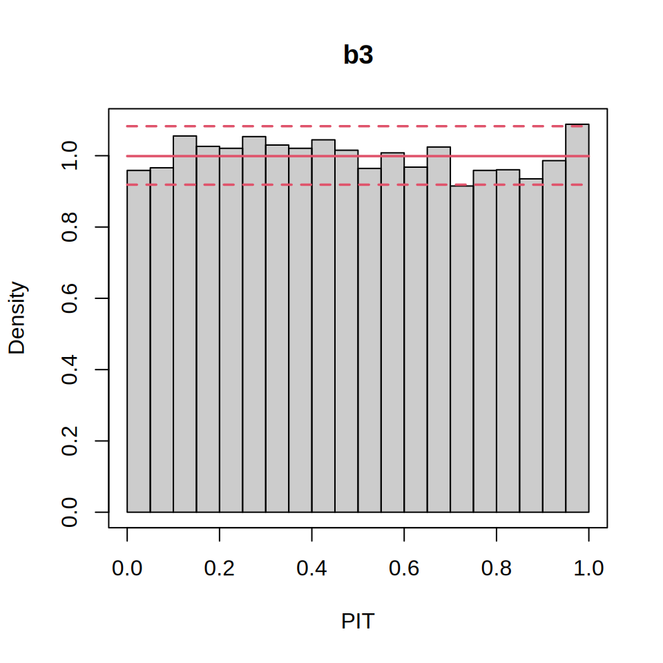 displays all estimated covariate effects. For residual diagnostics, gamlss2 leverages the topmodels package, which provides infrastructures for probabilistic model assessment. E.g., a PIT histogram can be created by